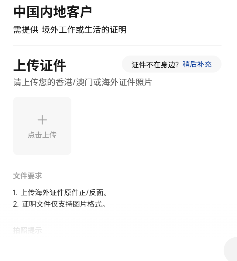 复星证券开户私教 文章目录(点击直达) 开户条件开户要点 开户条件 (1)必须通过专属链接开户,直接开户官网不审核的; (2)需要有境外卡,能够登录境外卡APP。 开户要点 (一):点击专属链接开户 (必须) (二):内地客户认证的步骤,选择“CA见证开户“ (三):登录你的境外银行APP,截图你登录后的页面,必须有你自己的名字; (四):接下来上传海外证件的步骤,上传你刚保存的境外银行账户截图; (五):加群,看群公告,私信报手机号即可,加急开通。 嫌麻烦的朋友,可以开必贝证券、致富证券,这两家不需要境外地址证明,直接自己就可以完成开户。